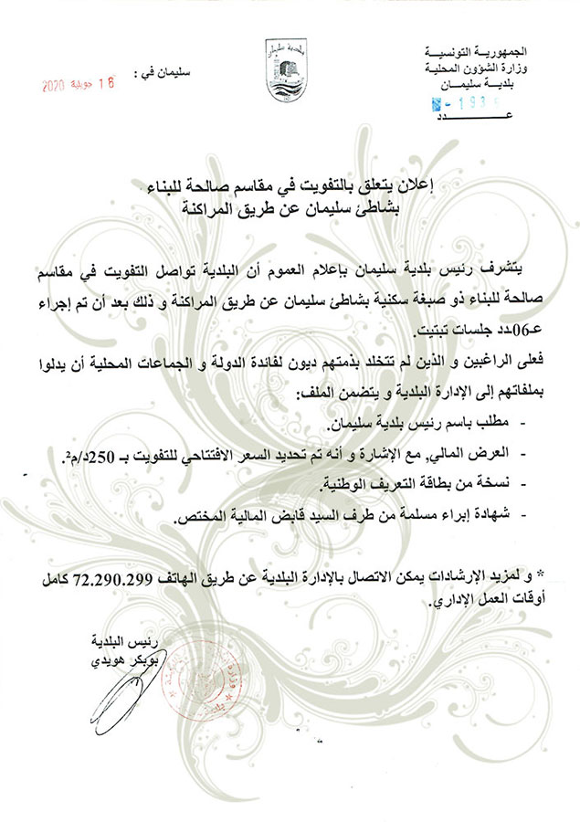 إعلان يتعلق بالتفويت في مقاسم صالحة للبناء بشاطئ سليمان عن طريق المراكنة.