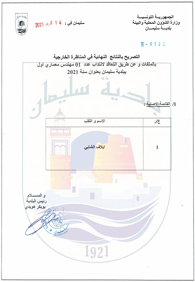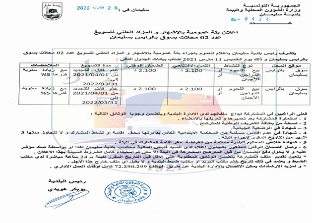 يعلم رئيس بلدية سليمان كافة متساكني المنطقة البلدية أن المجلس البلدي يعقد دورته العادية الأولى لسنة 2021 يوم السبت 27 مارس 2021 على الساعة العاشرة صباحا بقاعة الأفراح البلدية.