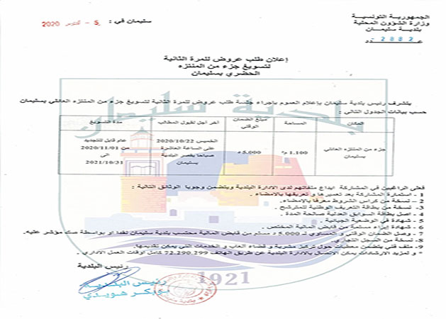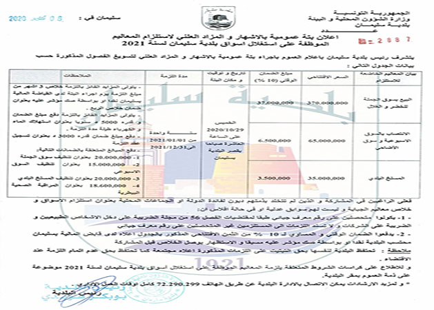 إعلان بتة عمومية بالإشهار و المزاد العلني لاستلزام المعاليم الموظفة على استغلال أسواق بلدية سليمان لسنة 2021.